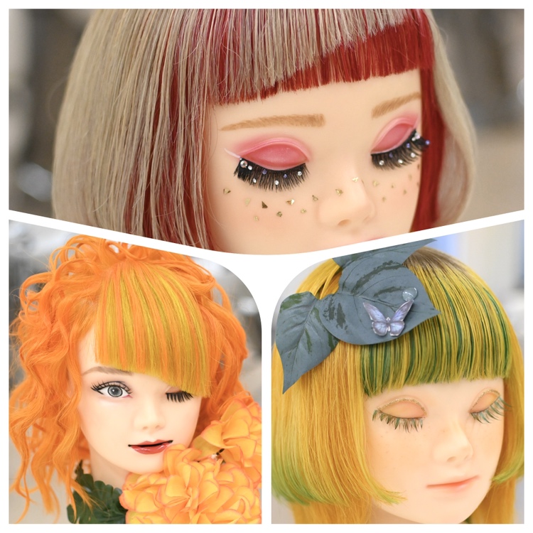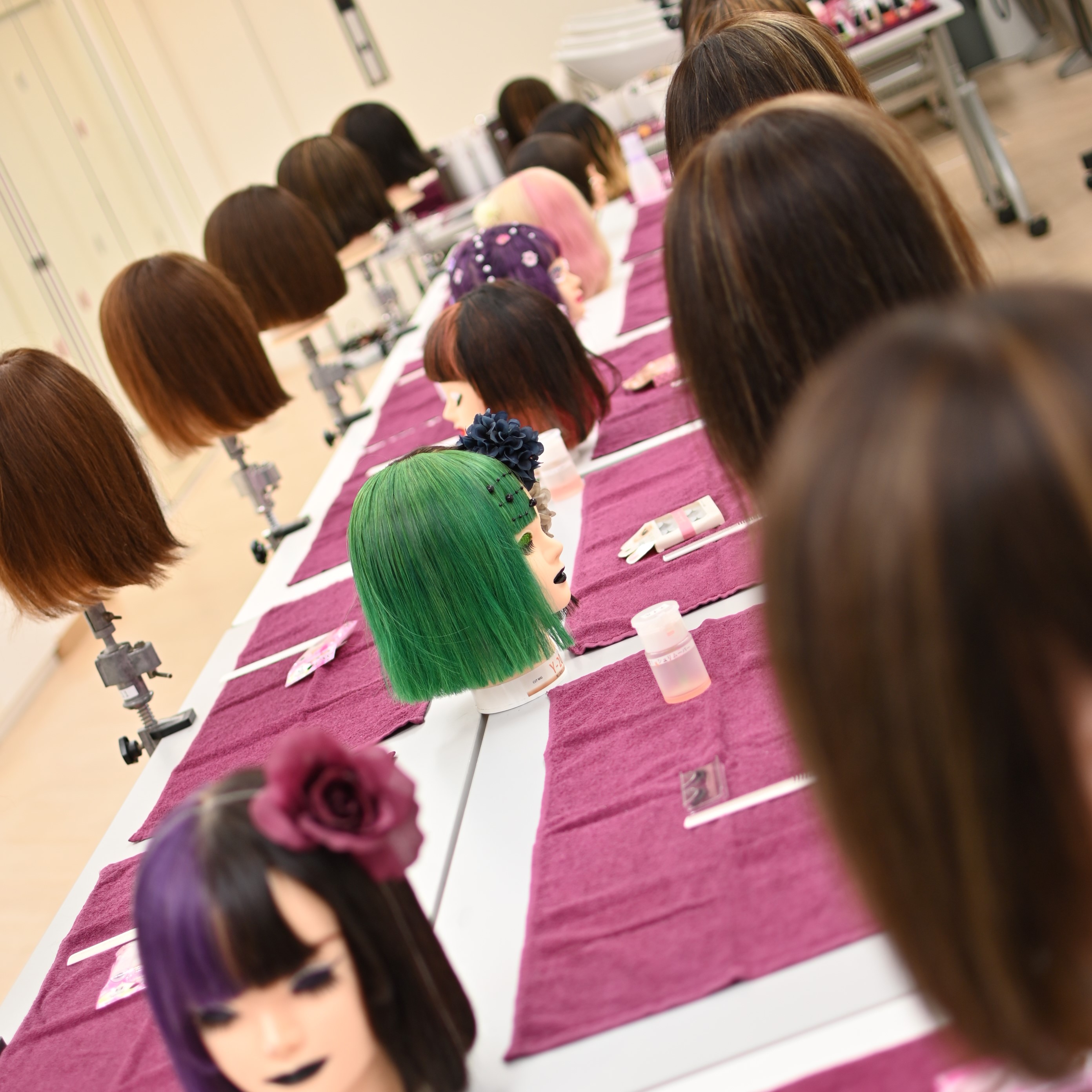 先輩たちが授業で作ったデザインウィッグを見本にして、自分だけのオリジナルのウィッグを作ってみよう♪